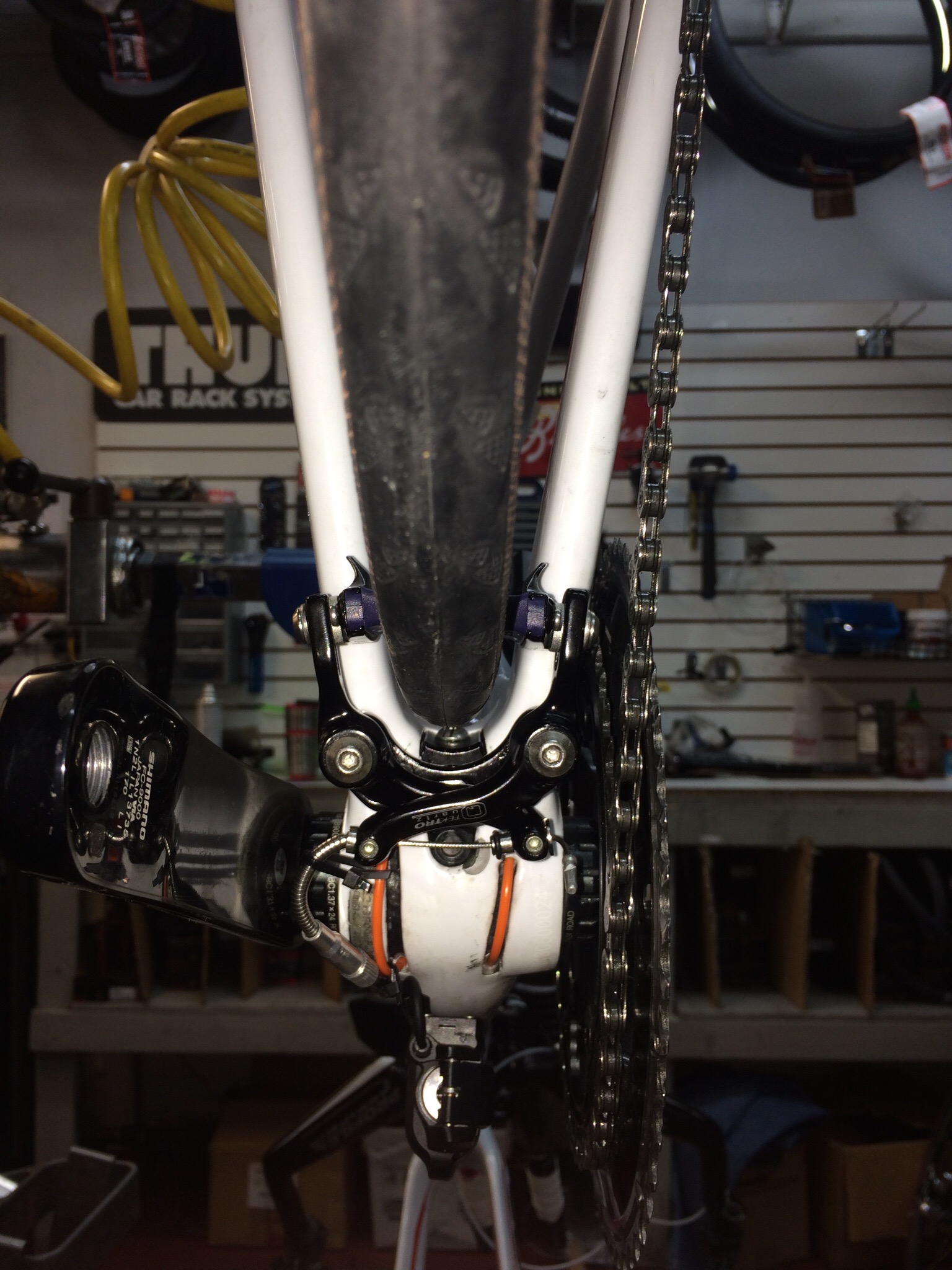 The rear is a bit more complicated, since it uses the Tektro R725, “u-brake” style system mounting under the bottom bracket. The brake cabling for the rear starts on the left side of the down tube, runs through the frame, and comes out near the bottom bracket. The entire brake cable goes through the frame – it was designed that way. Routing the brake cable through the left lever resulted in a much cleaner front end cable routing and less inner cable bend.