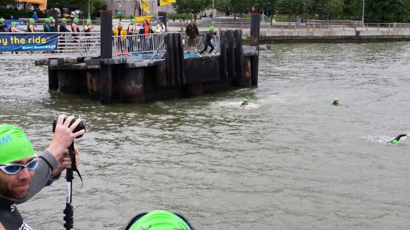 The Great Hudson Swim starts at Pier 45. We borrowed the NYC Water Taxi’s floating dock, which is a good 7-foot vertical jump into the Hudson. Hold onto your goggles!!!