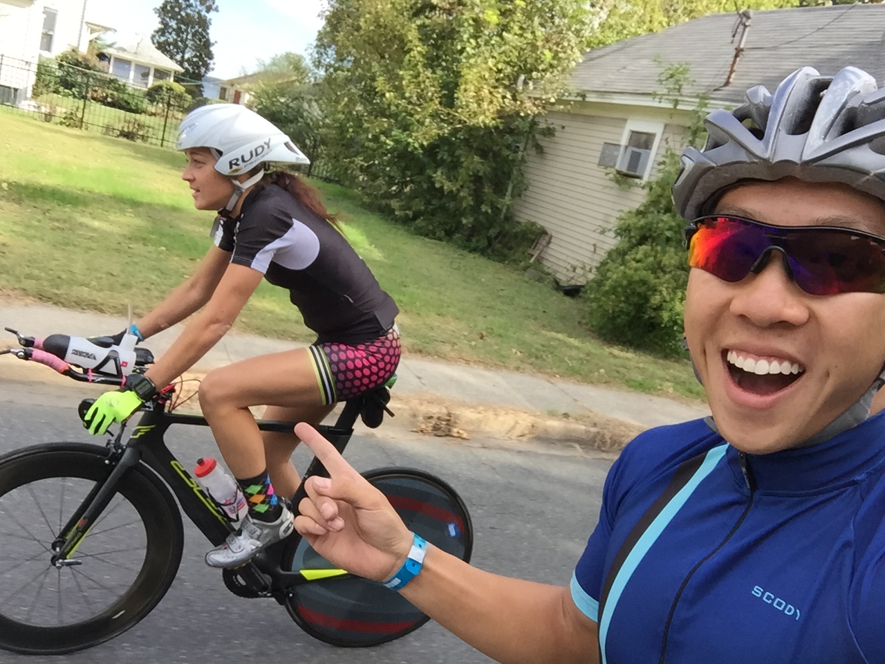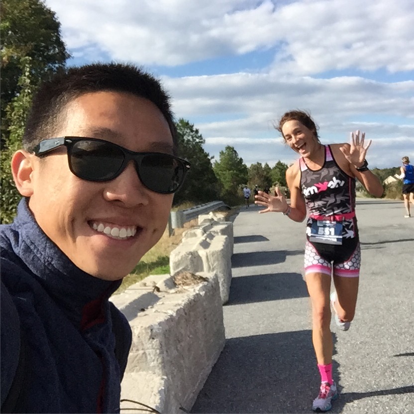 I spent the next 3-4 hours calculating the gap from 1st to 2nd place, bouncing around the run course on my road bike and cheering like a lunatic! Thanks to the 2.5 loop run course, I was able to see the runners come by about ~15 times before rushing over to the finishing line.